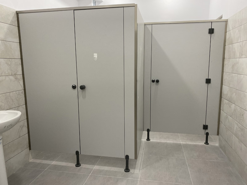 - fiecare usa este prevazuta cu o balama cu arc reglabil pentru autoinchidere. Usa nu se ridica in timpul utilizarii, este blocata. Nu poate fi scoasa accidental din balamale si nu poate accidenta utilizatorii cabinelor;